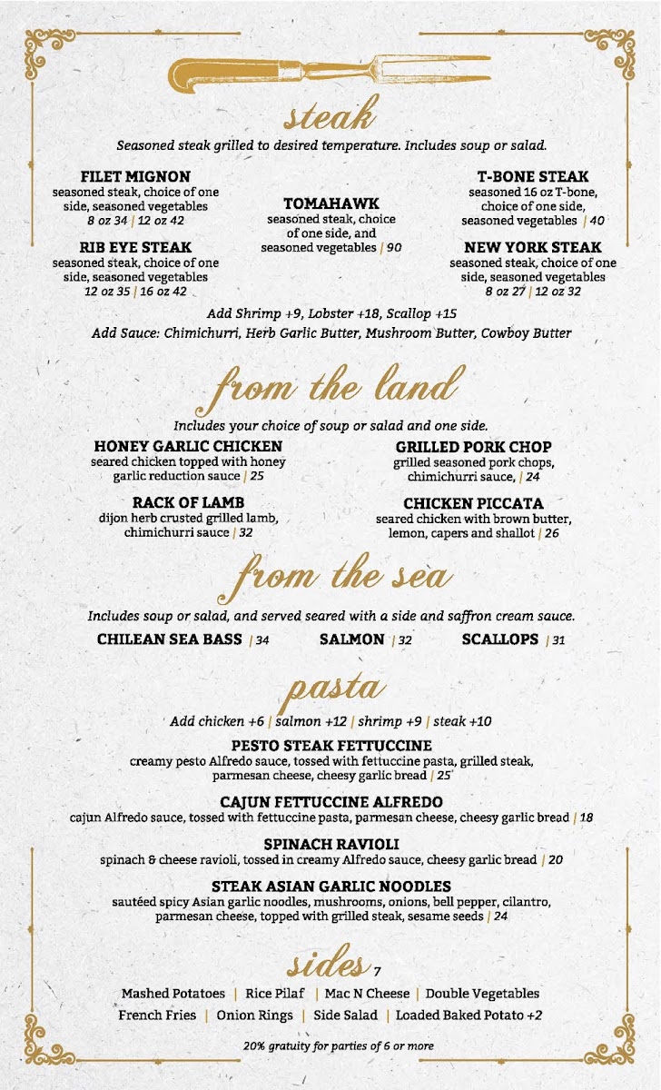 Manny's Steakhouse offers a menu that strikes a balance between hearty, classic steakhouse fare and approachable, casual dining options. The selections range from thoughtfully prepared steaks like Rib Eye and New York Steak to comforting dishes such as Clam Chowder and Fish & Chips, crafted to suit both lunch and dinner occasions.